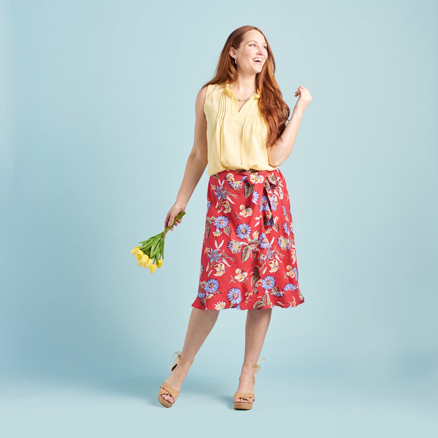 Pair our elegant blouse with the flowing charm of our faux wrap skirt for a look that’s effortlessly feminine and perfect for sunlit days.Lace Trimmed Ruffle Neck Sleeveless Blouse
