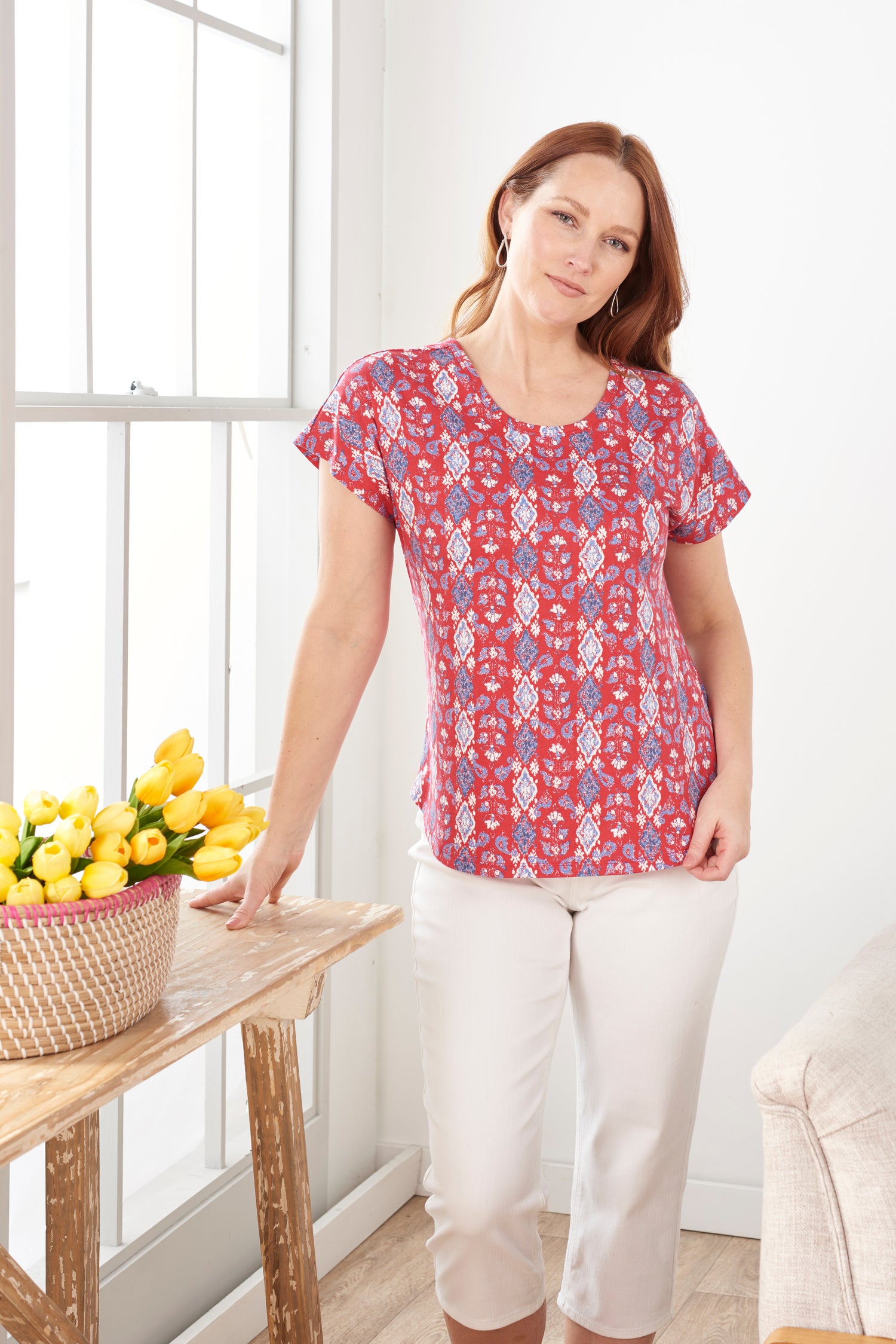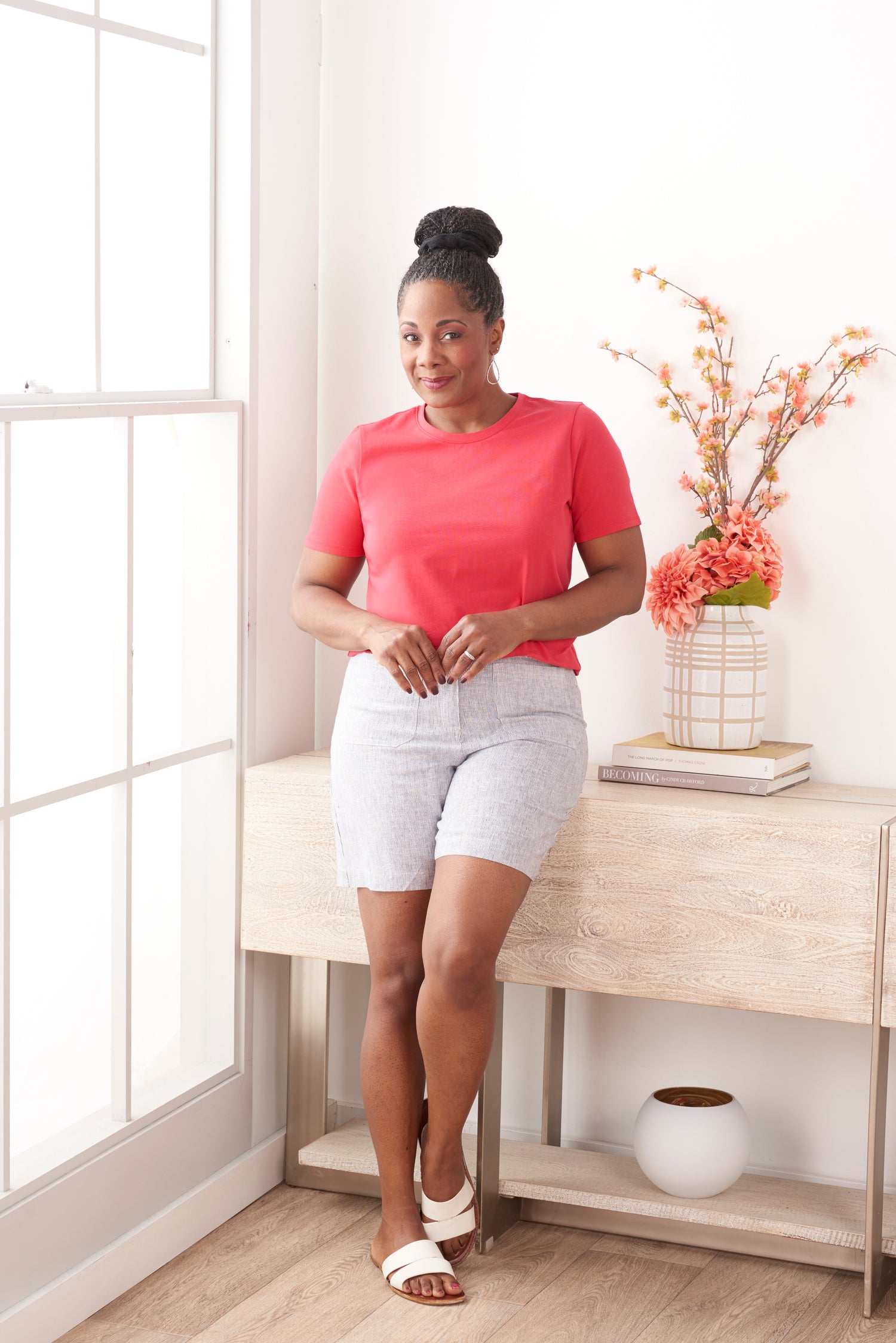 Slip into all-day comfort with our Perfect Tee and breezy printed linen-blend shorts—complete with patch pockets for that laid-back, just-right summer feel.Short Sleeve Crew Neck Missy Perfect Tee