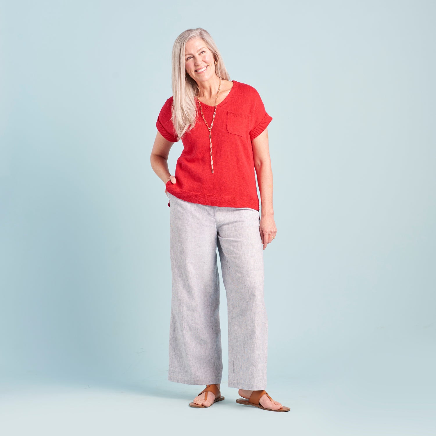 Breathe easy in our relaxed-fit sweater and pinstripe linen blend pants—a lightweight duo that keeps you cool, comfortable, and effortlessly polished.Slub Yarn V Neck Short Sleeve Sweater