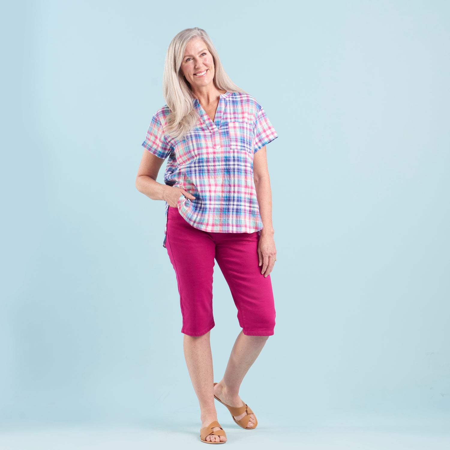 From casual beach days to sunset strolls, this dynamic duo brings the perfect mix of comfort, color, and style to your summer wardrobe.Plaid Y Neck Short Sleeve Top