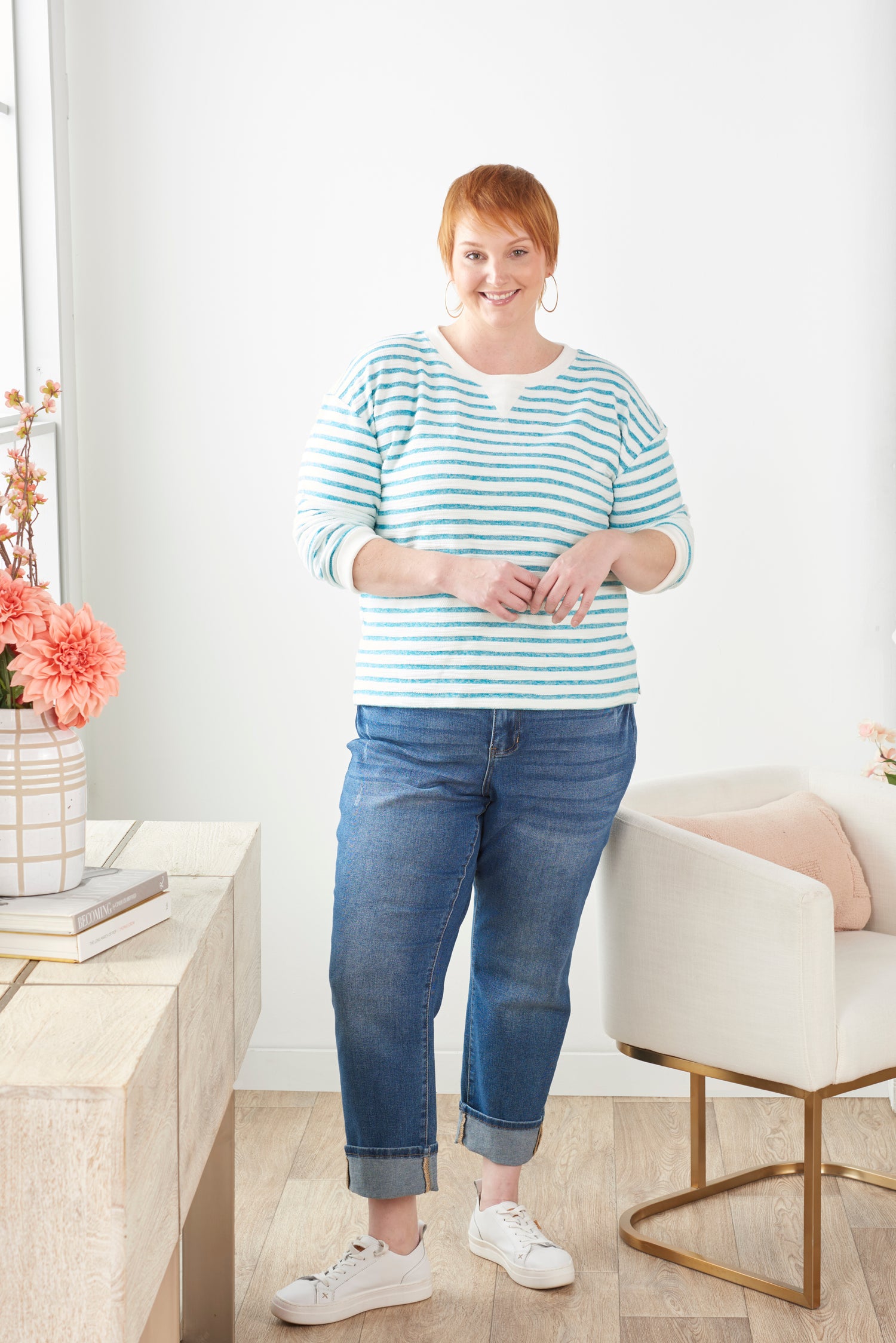Embrace the season with our ultra-soft, uniquely styled sweatshirt and laid-back, weekender jeans. Feel the breeze, make memories, and do it all in style.Relaxed Restyled Textured Stripe Sweatshirt