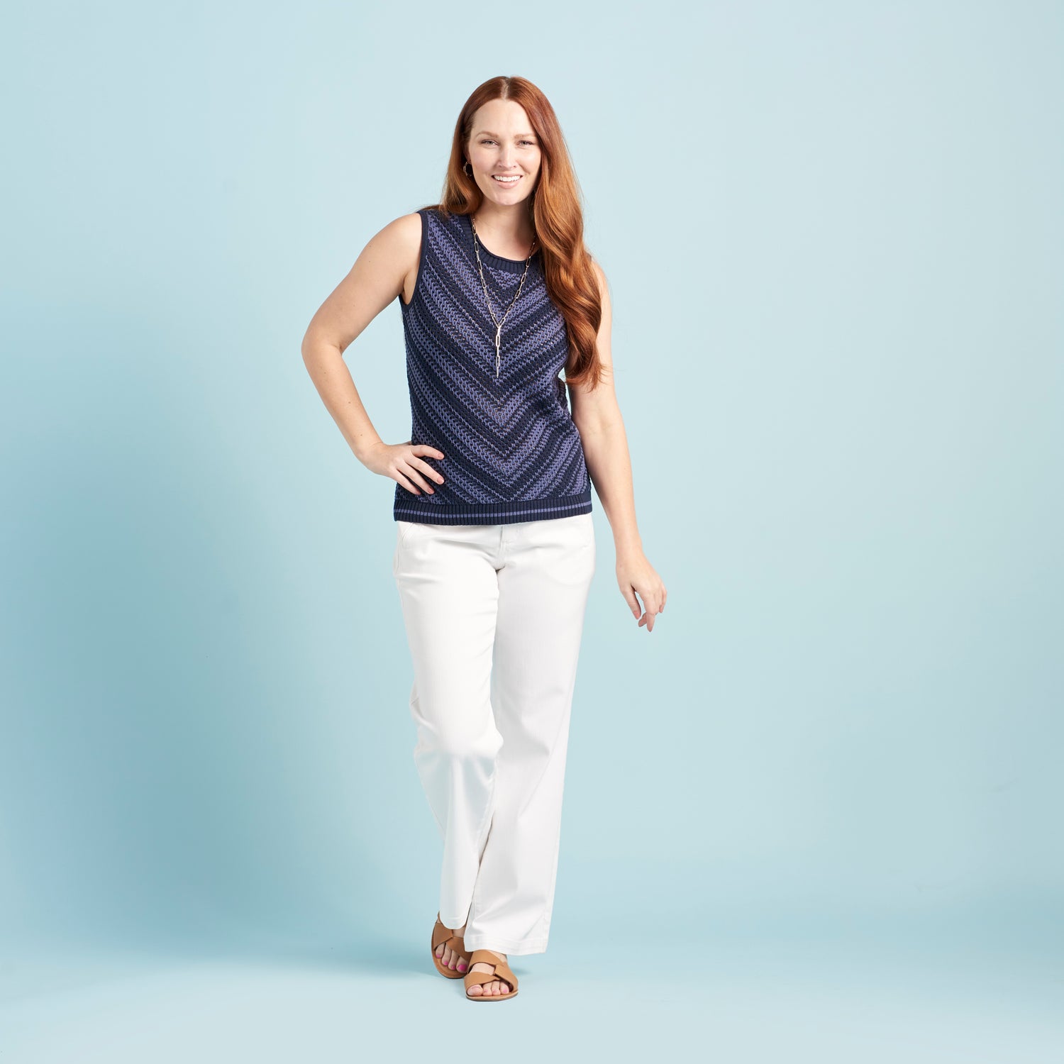 Elevate your summer wardrobe with our stylish sleeveless sweater paired perfectly with our modern shaped fit denim trouser for a look that blends bold patterns with timeless comfort.Chevron Stripe Sleeveless Sweater