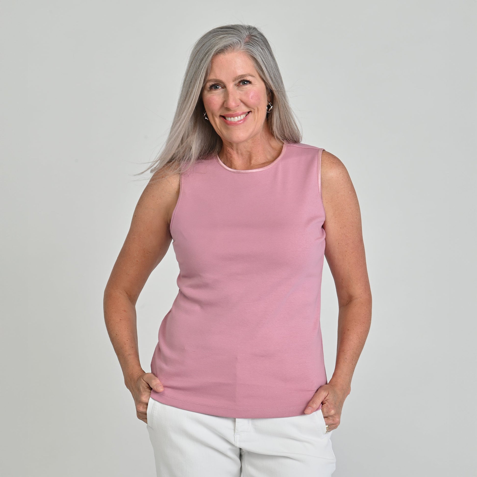 Make a statement of effortless elegance with our Sleeveless Crew Neck Satin Trim Perfect Tank, crafted from rib knit fabrication and designed for a sleek, flattering fit and finished with a luxe satin trim. Perfect for layering or wearing on its own, this versatile tank adds a touch of sophistication to any outfit, day or night.